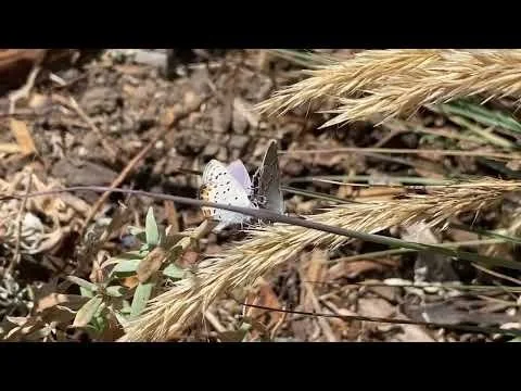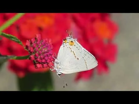 The name “Hairstreak” may refer both to the thin tails, which are part of an elaborate defense mechanism, and the thin streaks that mark the underside of the wings. The tails mimic antennae, and the eye spots mimic eyes. When the butterfly rubs its hindwings together to draw attention to this false head (see video), predators are fooled into thinking the tail is the head. The predator strikes there; the butterfly loses only a bit of wing, and flies away (butterflies are able to fly normally even with large chunks of wing missing).