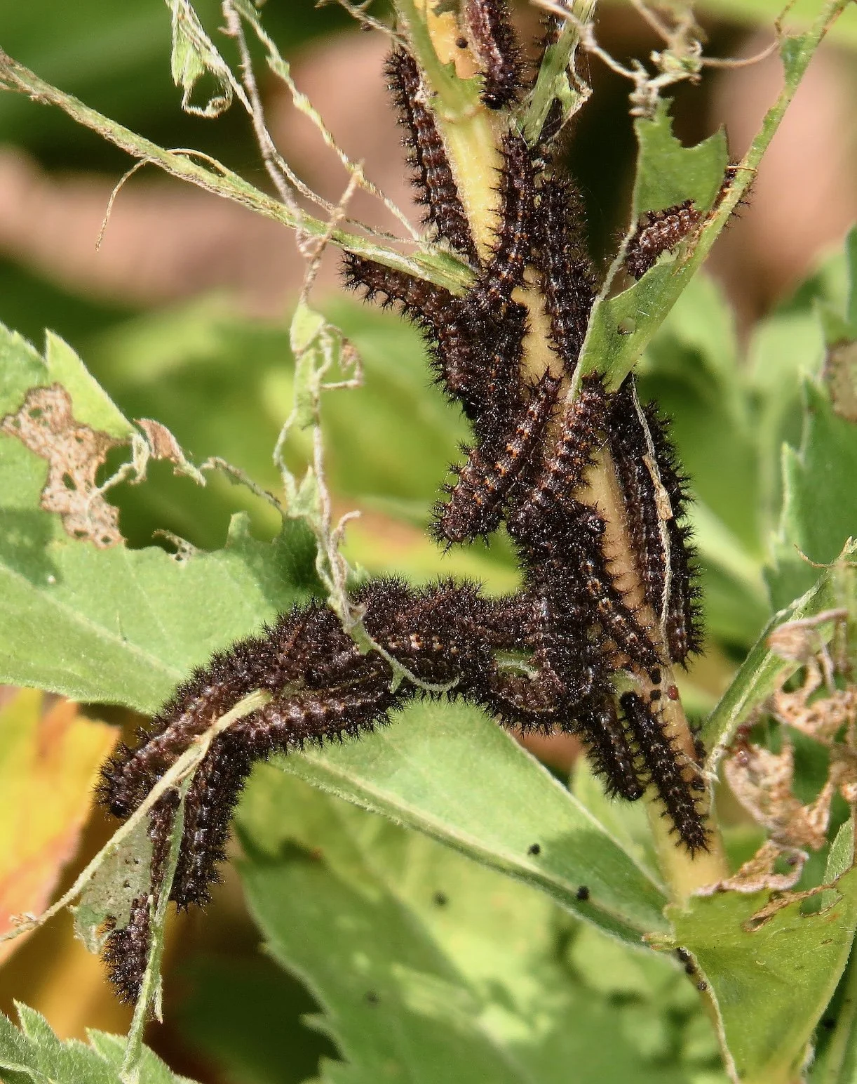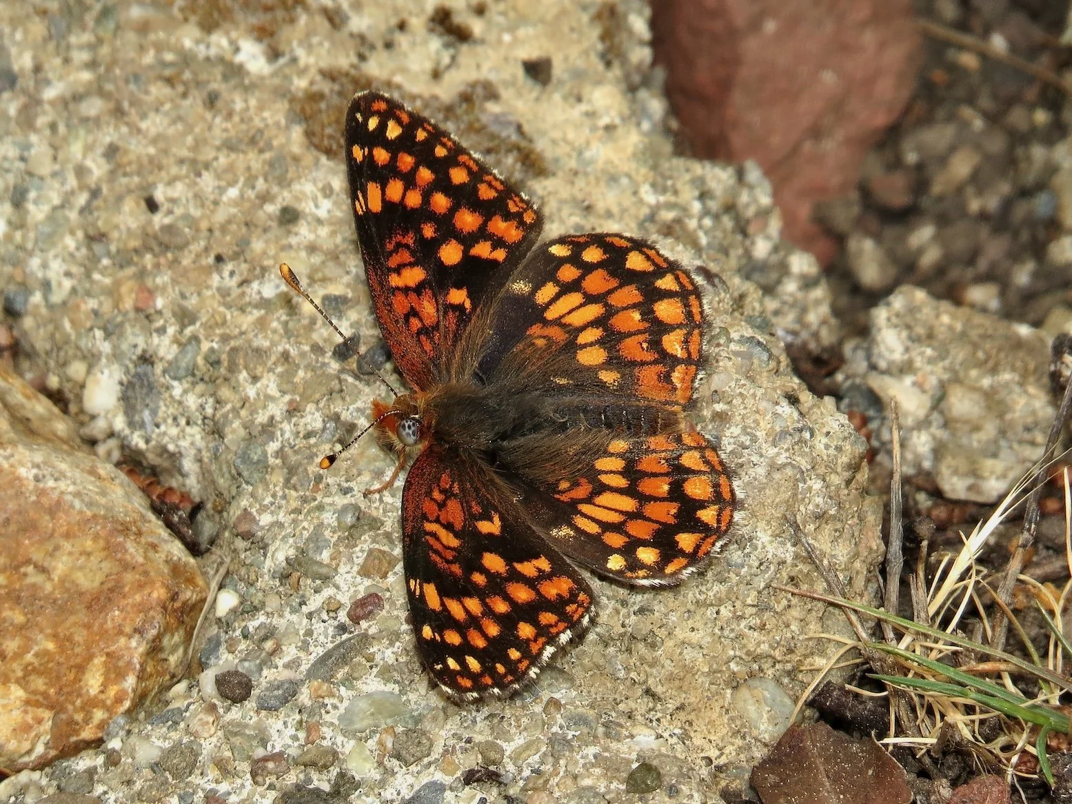 Northern Checkerspot females in our area come in three different forms. They can resemble the male, or mimic Variable Checkerspot, or mimic Field Crescent. Females lay eggs in clusters. The number of eggs laid at one time is highly variable, ranging from 17 to 160.